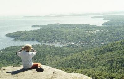 I don't recall many interesting sites along the way - there was a small stream at one point, of to the side of the trail. The view at the top is wonderful though. There's a great view of the ocean, which included many small boats tied up, at the time of year we were there. Most of the view is forestland - including Mount Battie, a smaller "mountain" nearby. There are a few buildings and roads visible as well.