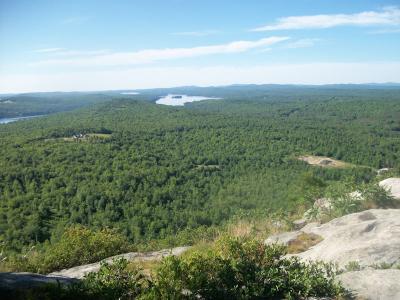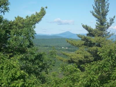 When you reach this point, don't stop. Make sure you continue on into the woods beyond the clearing. There's a little gully, and then up the other side you come out on some nice ledges with beautiful views of several lakes, Pleasant Mountain, Kearsarge North, and Mount Washington.